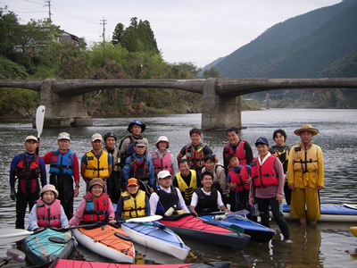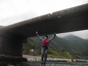 (左)岩間の沈下橋をバックに 森貞さん(A-1)