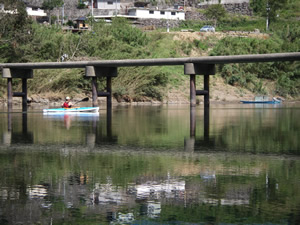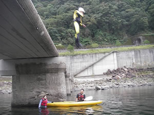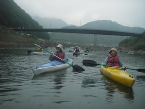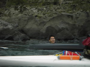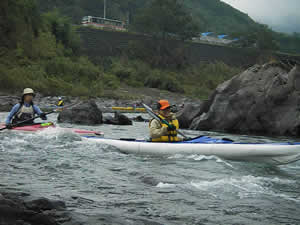 (左)岩が点在する瀬を軽快に 漕ぎぬける佐伯さん(PE400) 菅野さん(A-1)